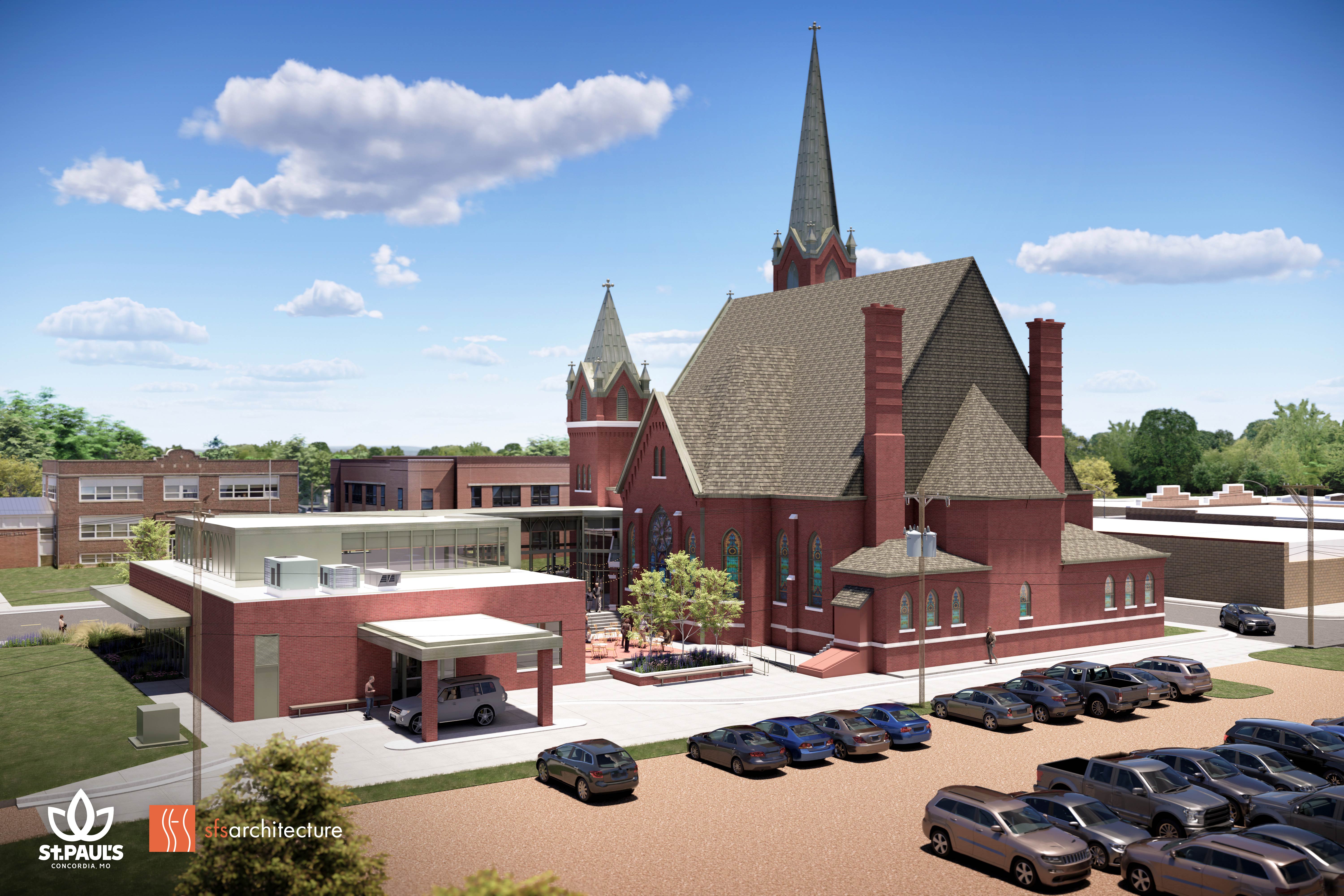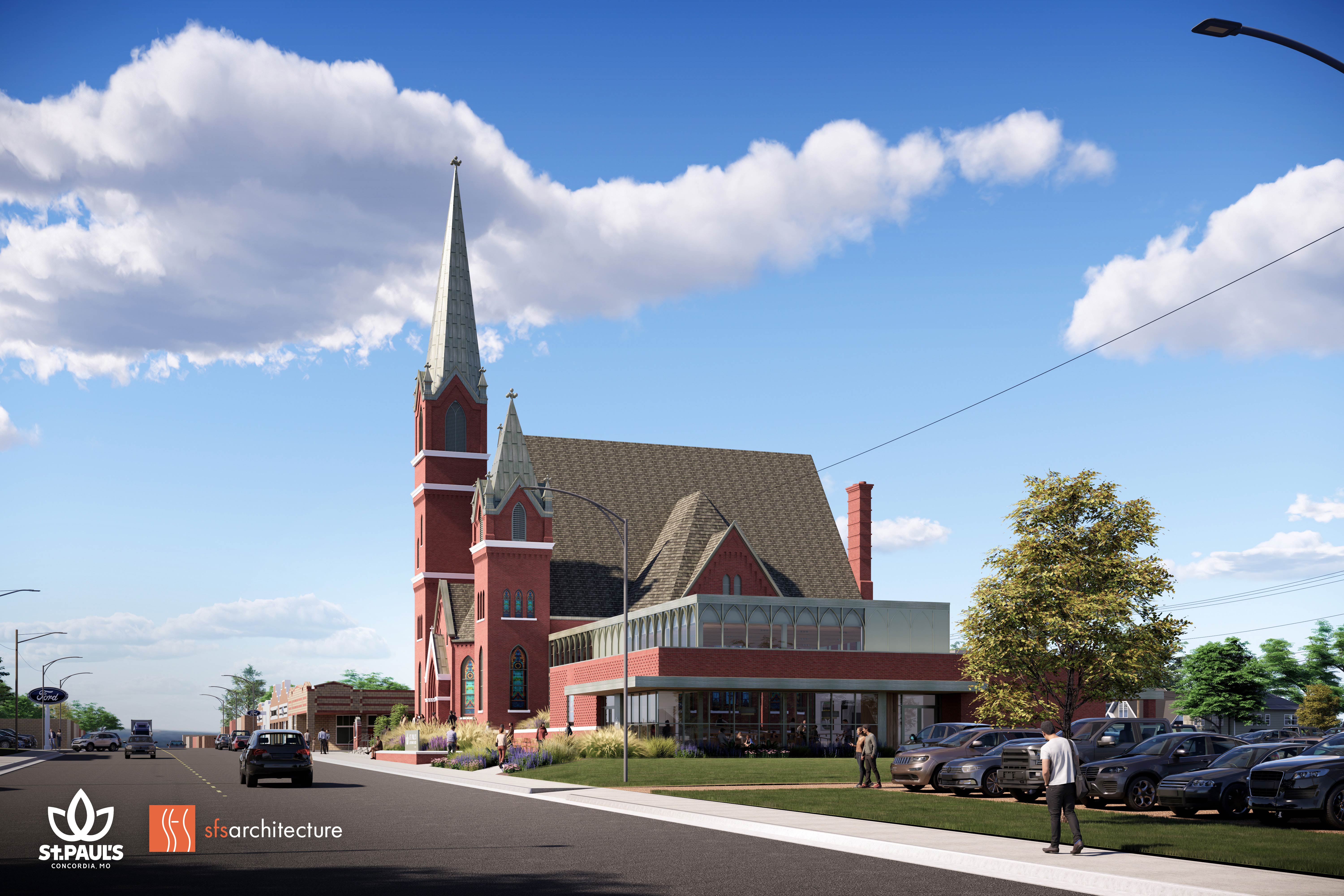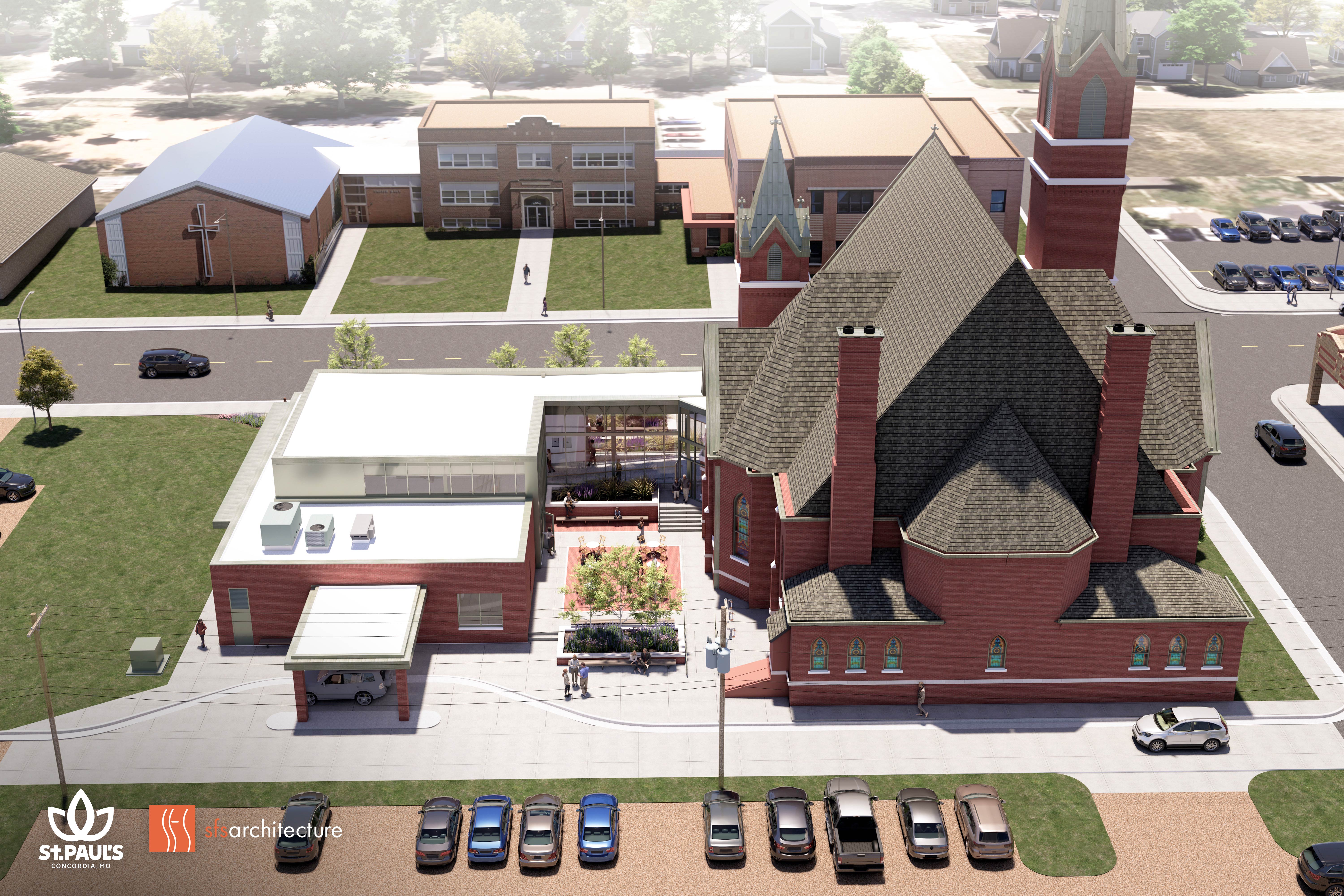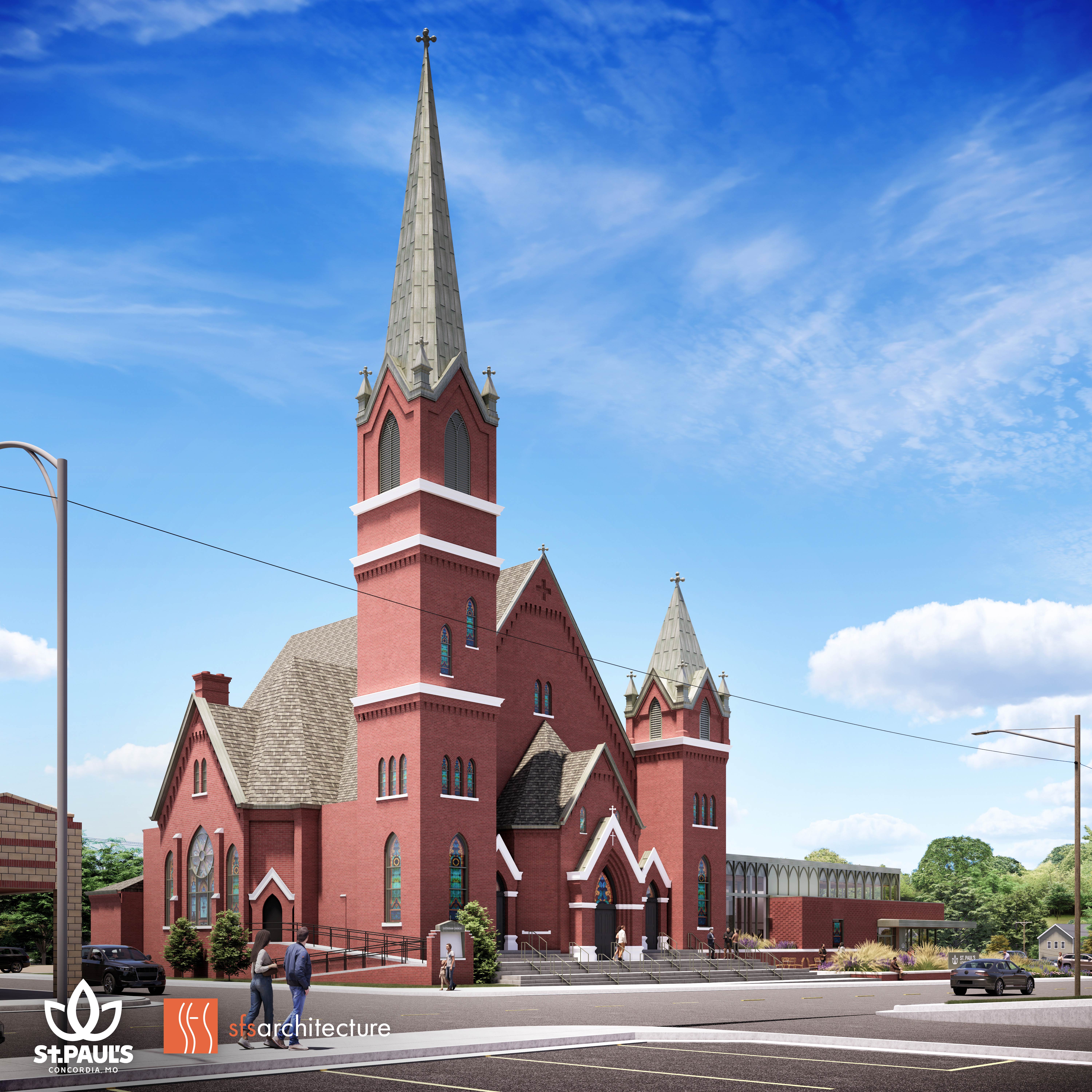 Visually link elements of the narthex to the historic sanctuary architecture, including a mix of surfaces (brick, glass, and a copper patina look) and decorative arches on the upper narthex windows. This follows guidelines for preservation of historic structures.